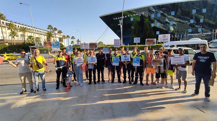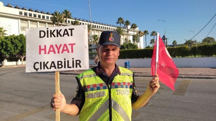 Jandarma personeli ve vatandaşlar, ellerinde 'Öncelik hayatın, öncelik yayanın', 'Hayata yol ver', 'Dikkat hayat çıkabilir' yazılı dövizlerle karşılarına çıktıkları sürücüleri alkışladı.