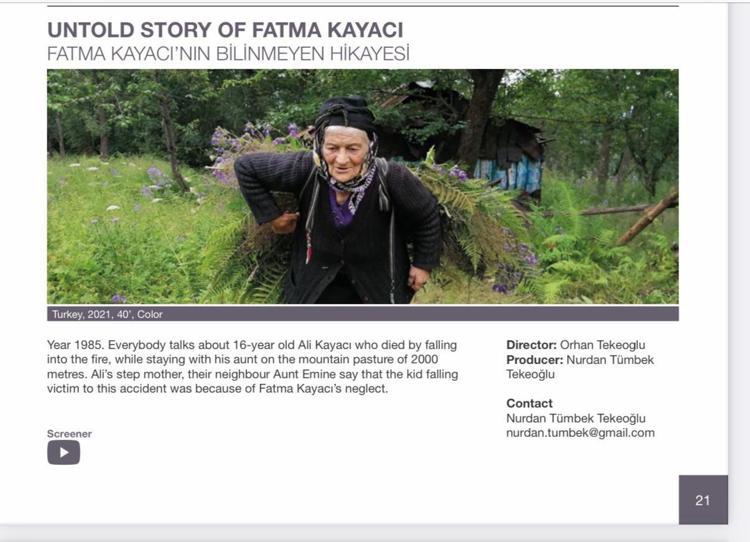 TRABZON'un Tonya ilçesinde yeğeninin ölümünden sonra küstüğü köyüne dönmeme kararı alıp, 37 yıldır Karakısrak Yaylası'nda yaz- kış tek başına yaşayan ve yörede ‘Robinson Nine’ olarak tanınan Fadime Kayacı'nın (87) hayatı belgesel oldu. Yapımcı ve yönetmen Nurdan-Orhan Tekeoğlu çifti tarafından hazırlanan 'Fatma Kayacı'nın bilinmeyen hikayesi' adlı belgesel, İtalya'da düzenlenen NuoviMondi Film Festivali'nde 600 eser arasında Jüri Özel Ödülü'ne layık görüldü.