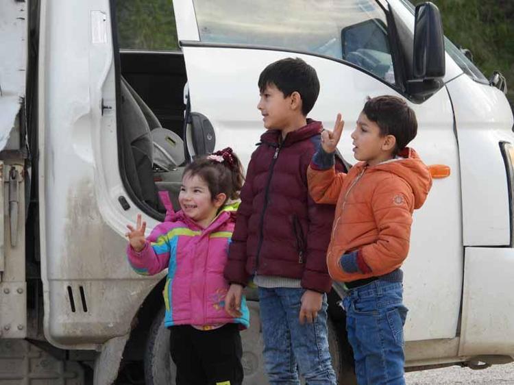 Gümrük kapısındaki İçişleri Bakanlığı Göç İdaresi Başkanlığı'nın mobil hizmet aracında işlemlerini yapan Suriyeliler, Türkiye'ye teşekkür ediyor.