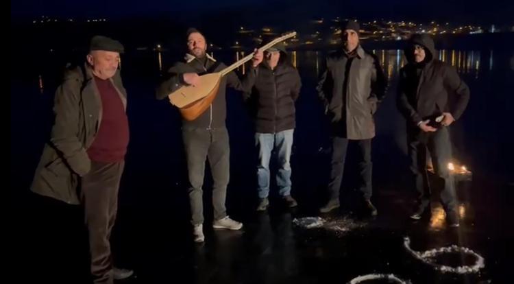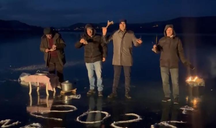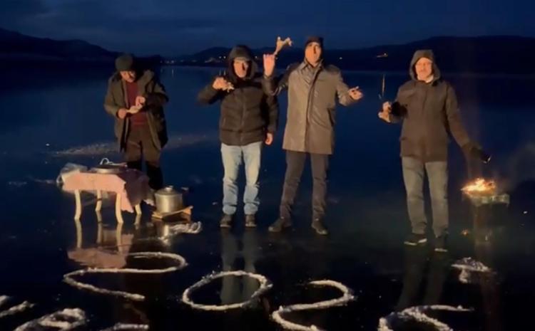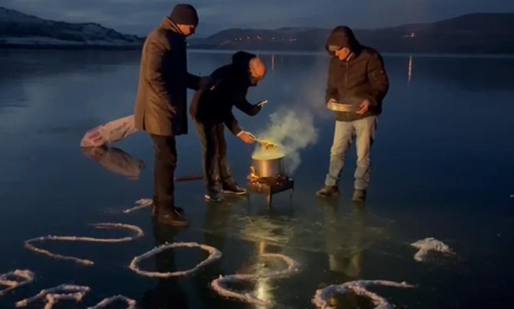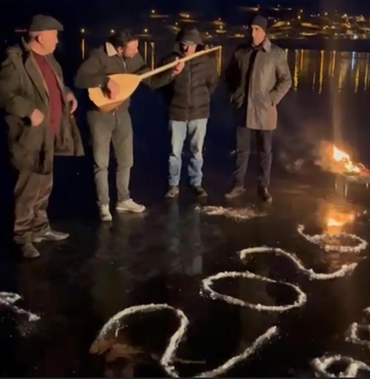 Kars’ın Arpaçay ilçesine bağlı Doğruyol köyünde yaşayan bir grup arkadaş 2026 yılını buz tutan Çıldır gölünün yüzeyinde kaz eti yiyerek, halaylarla karşıladı.