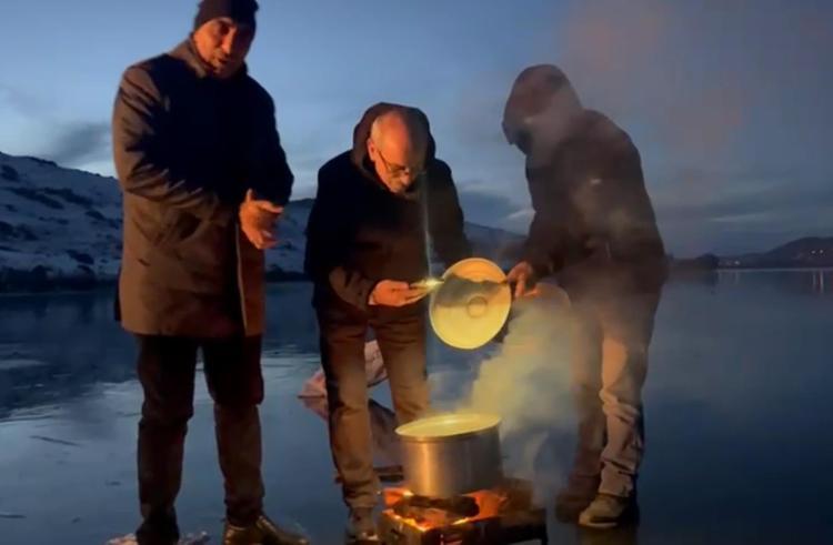 Arpaçay’ın Doğruyol köyünde yaşayan Asım Öztürk, Çetin Cengiz, Engin Yalçın, yeni yılın son anlarında Ardahan Çıldır ile Kars’ın Arpaçay sınırlarında yer alan Çıldır gölünün buz tutan yüzeyinde buluştu. Gündüz saatlerinde hazırladıkları kaz etini yaktıkları ateşin üstündeki kazana atan arkadaşlar, bir süre pişmesini bekledi.