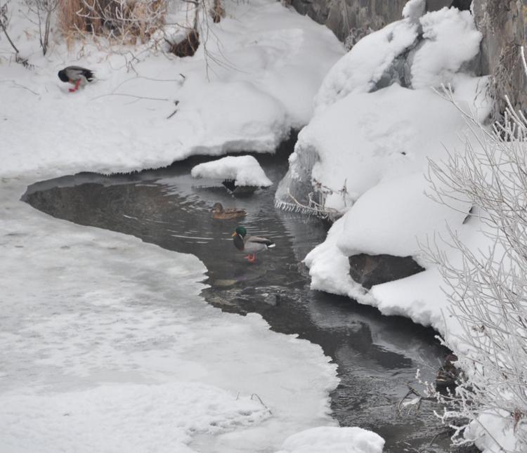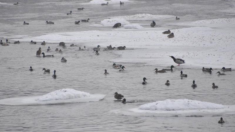 Yeşilbaş ördeklerin yüzeyi kısmen donan çayda yaşam mücadelesi
