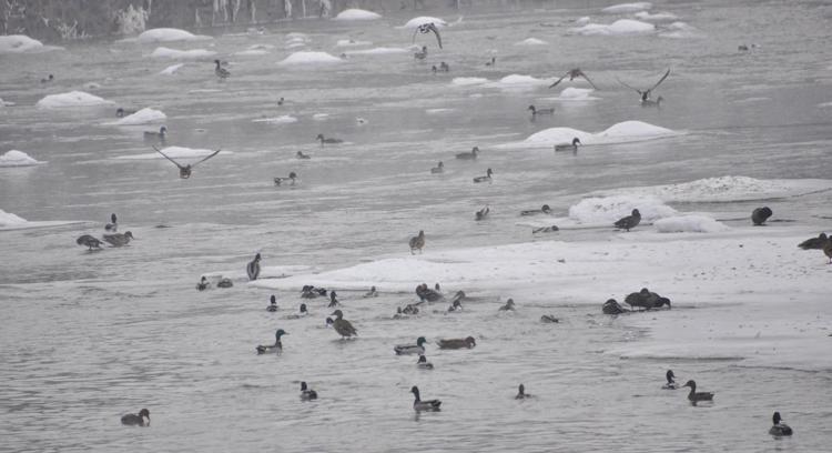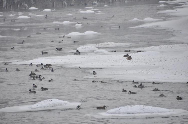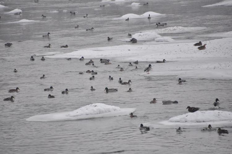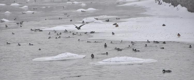 Buz kütlelerinin arasında toplu halde yüzen ördekler, beyaz örtüyle kaplı doğada güzel görüntüler oluşturdu.