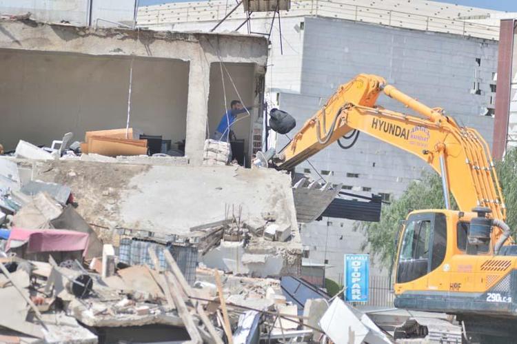 Haraparası Mahallesi Küçük Sanayi Caddesi’nde depremde ağır hasar gören 2 katlı binanın yıkımı için sabah saatlerinde ekipler bölgeye gitti.