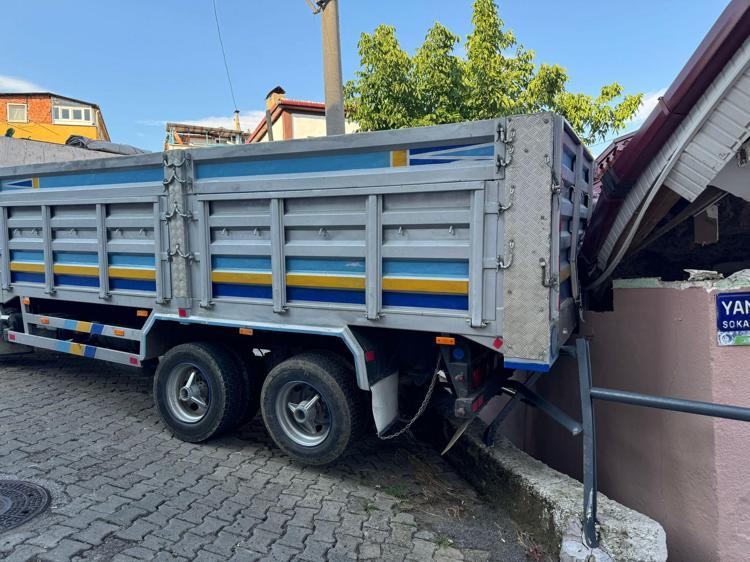 Yokuş çıkarken geri kayan kamyon evine çarptı, kendini dışarı atarak kurtuldu