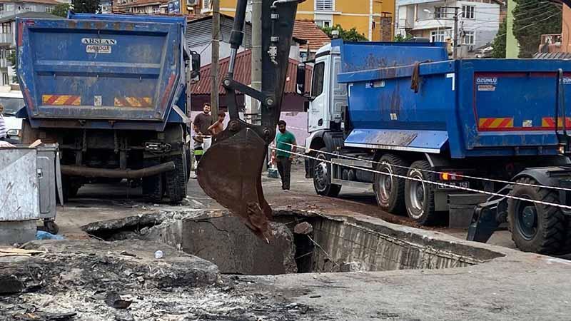 Kocaeli'nin İzmit ilçesinde seyreden hafriyat kamyonu, yolun çökmesi ile oluşan çukura düştü.