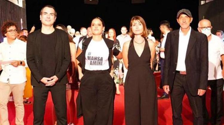 Yönetmen Okyay, cumartesi günü gerçekleştirilen açılış gecesine, İran'da ahlak polisi tarafından gözaltına alındıktan sonra yaşamını yitiren Mahsa Amini'nin adının yazılı olduğu tişörtle katılarak dikkat çekti.