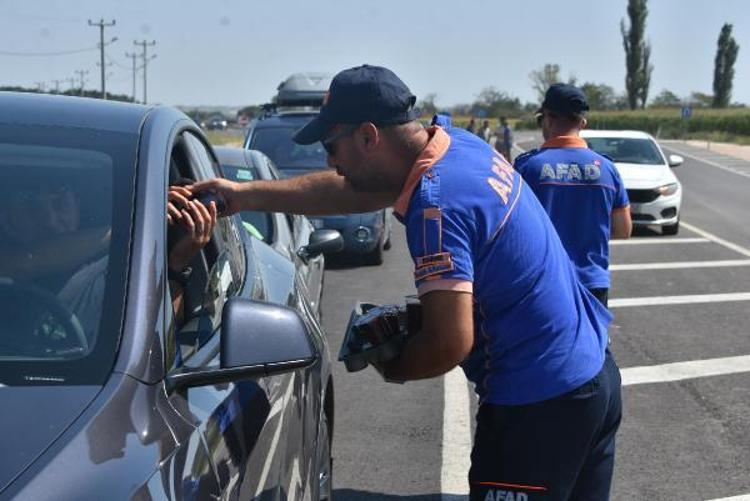 Hava sıcaklığının 35 derece ölçüldüğü Edirne'de, AFAD Edirne İl Müdürlüğü ekipleri, kuyrukta araçlarıyla çıkış için bekleyenlere, soğuk şerbet ve su dağıtımı yaptı. (DHA)