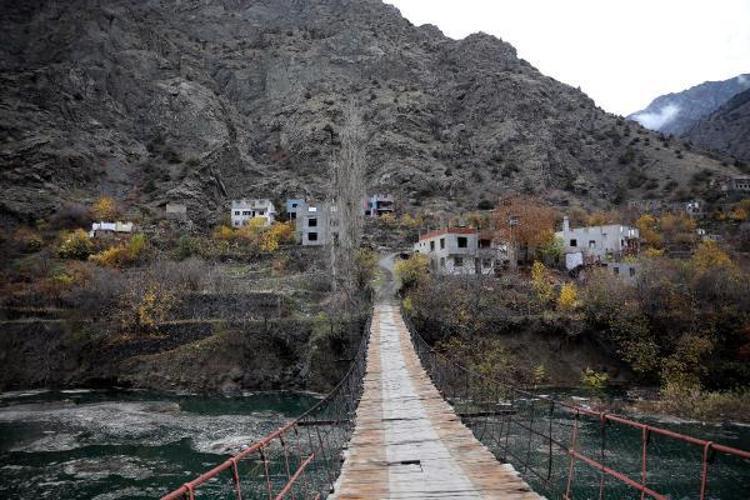 Yusufeli Barajı'nda 46 metreye ulaşan su seviyesi ile eski Yusufeli-Erzurum kara yolu bitişiğindeki Irmakyanı köyü kısmen su altında kaldı. Tek ulaşımın sağlandığı asırlık asma köprünün de sulara gömüldüğü köye gidenler, evlerine uzaktan son kez bakıyor.