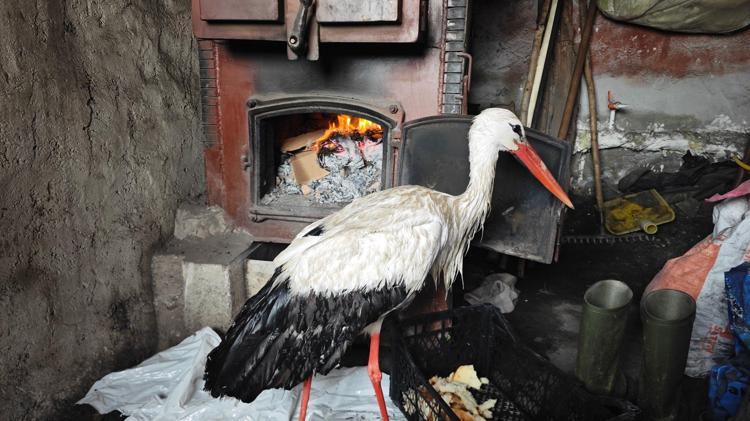 Hakkari'nin Yüksekova ilçesinde yaşayan Burhan Yalçın (40), yuvasından düşen, kanatları donan ve uçamayan leyleği evine getirip, sıcak ortamda su ve yiyecek verdi.