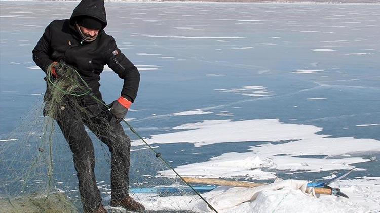 Yeni yılın ilk günlerinde sabah erken saatlerde donan gölün üzerinde kazma ve küreklerle küçük delikler açan balıkçılar, 10 metre uzunluğundaki tahta sırıkla ağlarını suya bıraktı.