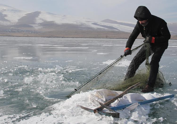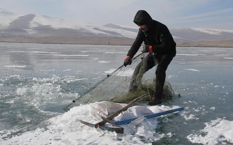 Balıkçılar, 123 bin metrekare alanı ile Doğu Anadolu Bölgesi'nin en büyük tatlı su ve en büyük ikinci gölünün yüzerinde oluşan yaklaşık 15 santimlik buz tabakasını kazma ile kırarak, Eskimo usulü balık avına başladı.
