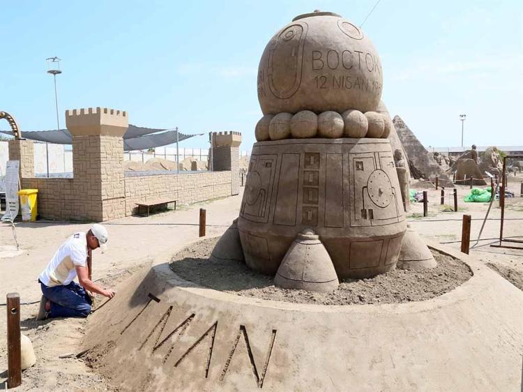 Vostok 1 kapsülünün yarım ölçekli heykelini yaptık. 1969'da Neil Armstrong'un, uzay aracıyla ve Ay'a ayak bastığı anı canlandıran heykeli var. 10 yıl önce yaptığımız Piramit ve Sfenks ve heykeli vardı. Bu heykel üzerinde bazı değişiklikler yaptık. Firavun ve mumya ekledik. Roketler bölümü var. Uzayla alakalı yapılan çalışmalar, bilimsel araştırmalar ve önemli filmlerle ilgili eserler yapıldı ve sanatseverlerin beğenisine sunulacak. 1 Mayıs'ta ziyaretçe açılıyoruz ve 09.00- 23.00 saatleri arasında ziyaretler yapılabilecek. Gece renkli, ışıklandırılmış hali izlenebilecek. Çocuklar için de özel atölyede minik kum heykel etkinleri ile kum heykel sanatıyla tanışma fırsatı oluşacak."