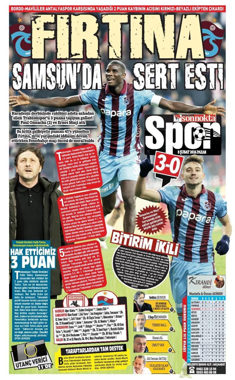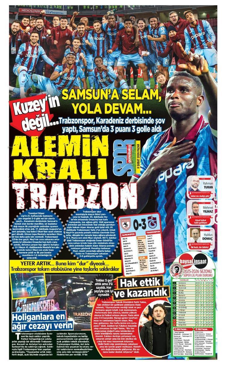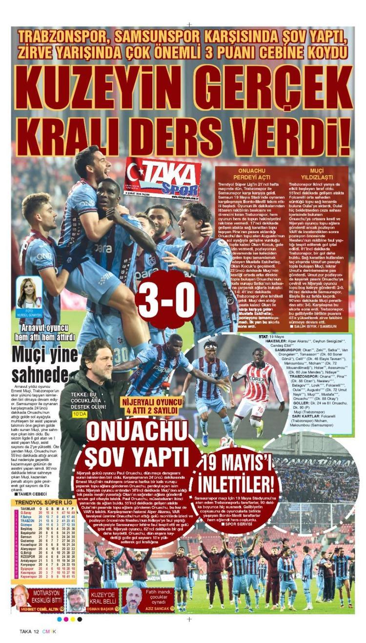 Öte yandan Samsunspor ise, Süper Lig’de 2014/15 sezonundan bu yana isabetli şut çekemeden en fazla şut attığı karşılaşmayı Trabzonspor’a karşı oynadı. Trabzon yerel basın manşetleri şu şekilde: