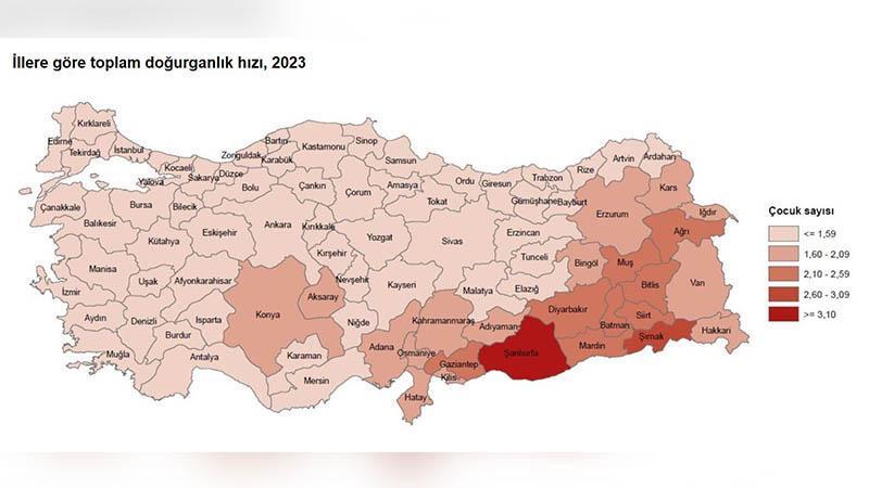 İllere göre toplam doğurganlık hızlarına bakıldığında toplam doğurganlık hızının en yüksek olduğu il 3,27 çocuk ile Şanlıurfa, en düşük olduğu il ise 1,13 çocuk ile Bartın oldu. Nüfusun kendini yenileme düzeyi olan 2,10 doğurganlık hızının üzerinde ise yalnızca 10 il yer aldı. Bu iller; Ağrı, Bitlis, Diyarbakır, Gaziantep, Mardin, Muş, Siirt, Şanlıurfa, Batman ve Şırnak'tan oluştu. Ancak bu illerde de doğurganlık hızı önceki yıllara göre düşüş gösterdi. Doğurganlık hızı en yüksek il Şanlıurfa'da doğurganlık hızı, 2018'de 4,16 çocukken 2023'te 3,27 çocuğa geriledi. Aynı yıllarda doğurganlık hızları; Ağrı'da 3,29'dan 2,20'ye, Bitlis'te 3,07'den 2,21'e, Diyarbakır'da 2,97'den 2,22'ye, Gaziantep'te 2,86'dan 2,10'a, Mardin'de 3,16'dan 2,40'a, Muş'ta 3,25'ten 2,24'e, Siirt'te 3,18'den 2,23'e, Batman'da 2,91'den 2,18'e ve Şırnak'ta 3,63'ten 2,72'ye geriledi.