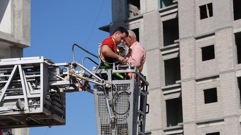 Mersin'de 14 katlı bina inşaatında dış cephe çalışması yapan 2 işçi, elektrik arızası nedeniyle 13'üncü katta iskelede mahsur kaldı. İşçiler, itfaiye ekipleri tarafından kurtarma aracının 54 metre uzunluğundaki merdiveniyle kurtarıldı.