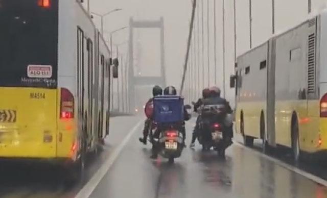 15 Temmuz Şehitler Köprüsü'nde şiddetli lodos nedeniyle köprü üzerinde ilerlemekte zorlanan 4 motosiklet sürücüsüne 2 İETT otobüsü siper oldu. O anlar kameralara yansıdı.