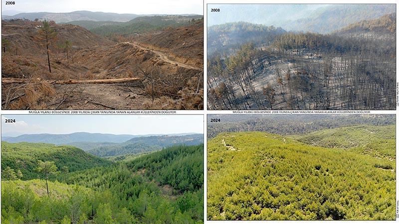 Muğla Orman Bölge Müdürlüğü 2008'deki alanın zarar görmüş hali ile 2024 yılında yeşile döndüğü fotoğrafları sosyal medya hesabından paylaştı. (DHA)