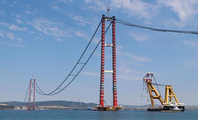 1915 Çanakkale Köprüsü’nde, her biri 45 metre genişliğinde, 48 metre uzunluğunda ve 700 ton ağırlığındaki tabliye bloklarının montajı için yapılan hazırlıklar ve kedi yolları arasında geçişi sağlayan köprülerin söküm çalışmaları nedeniyle, Boğaz tek yönlü olarak gemi geçişlerine kapatıldı. Çalışmalara, tabliye bloklarının montajı için gelen Singapur bayraklı 'Asian Hercules-III' isimli yüzer vinç de katıldı. Yarın, ilk tabliye bloğunun Lapseki yakasında bulunan 318 metre uzunluğundaki kuleye getirilecek.