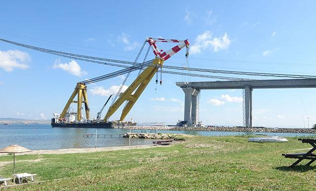 Cumhurbaşkanı Recep Tayyip Erdoğan'ın, 18 Mart 2017'de temelini attığı 1915 Çanakkale Köprüsü'nde ana halatların montajının tamamlanmasının ardından köprünün yolunu oluşturacak tabliye bloklarının montajına bugün itibari ile başlandı. İlk tabliye bloğu, Singapur bayraklı 'Asian Hercules-III' isimli yüzer vinç yardımıyla, Çanakkale Boğazı'nın Asya yakasındaki Lapseki ilçesinde yapımı tamamlanan 680 metre uzunluğundaki yaklaşım viyadüğünün ucuna yerleştirildi. Gelibolu yakasında bulunan 365 metre uzunluğundaki yaklaşım viyadüğünün ucuna ise ilk tabliye bloğu montajı birkaç gün içerisinde yapılacak. Köprünün yolunu oluşturacak tabliye bloklarının montajı yaz sonuna kadar tamamlanmış olacak. 1915 Çanakkale Köprüsü'nün yolunu, her biri 45 metre genişliğinde, 48 metre uzunluğunda ve 700 ton ağırlığındaki 87 tabliye bloğu oluşturacak.
