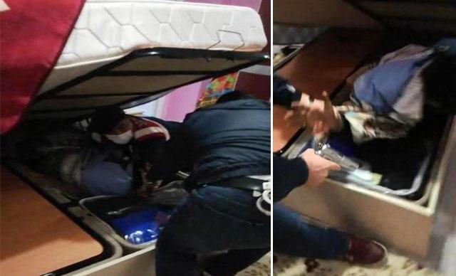 Jandarma personelinin baskın yapılan evlere galoş giyerek girdiği operasyonda bir şüpheli ise, baza altındaki çarşafların arasına gizlenmiş halde bulundu.