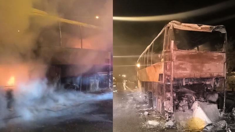 Adana'da otoyolda ilerlerken alev alan yolcu otobüsü, kullanılamaz hale geldi.