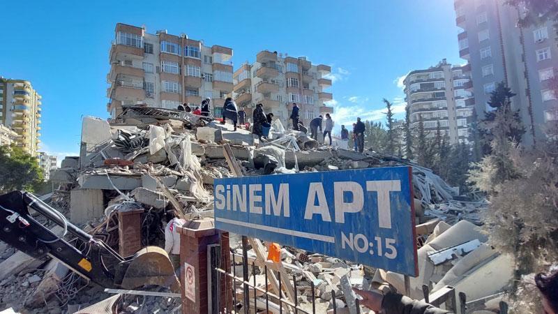Adana'nın Çukurova ilçesi Yurt Mahallesi'ndeki Sinem Apartmanı'nın yıkıldığı an, bir iş yerinin güvenlik kamerasına da yansıdı. Görüntülerde bir başka binadan deprem anında dışarı çıkarak bindikleri otomobille kaçmaya çalışan vatandaşlar yer alıyor. Sinem Apartmanı, vatandaşların otomobillerine bindiği sırada bir anda yıkılıyor. Apartmanın yıkılışıyla birlikte büyük bir toz bulutu oluşuyor.