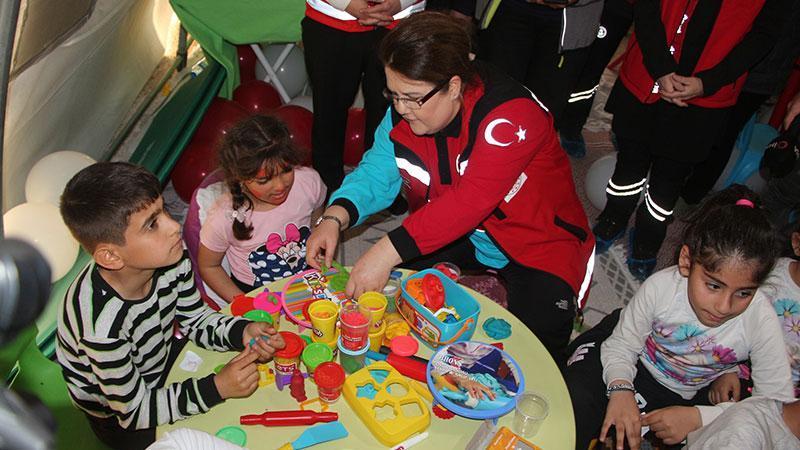 Aile ve Sosyal Hizmetler Bakanı Derya Yanık, Hatay'da ziyaret ettiği depremzede çocuklarla Psikososyal Destek Çocuk Oyun Alanı'nda boyama yapıp, oyun hamuru oynadı.