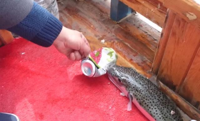 Balon balık, tekne güvertesinde kendisine uzatılan teneke kutuyu hiç zorlanmadan parçaladı.