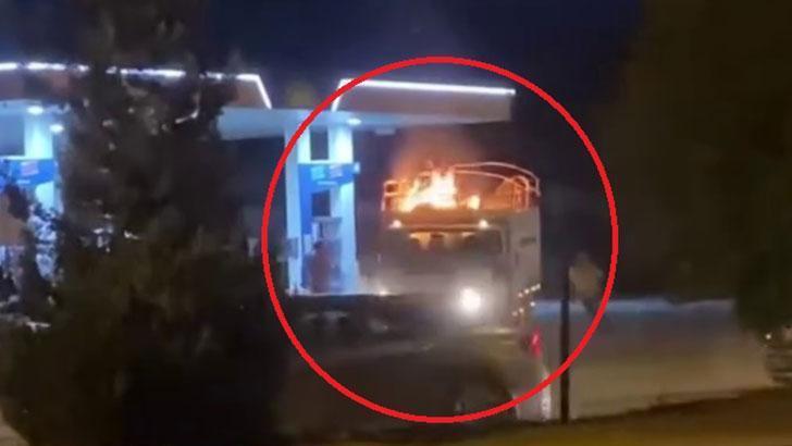 Alev alan kamyonet, girdiği akaryakıt istasyonunda söndürüldü
