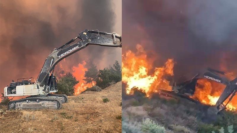 Hatay'da 3 gün süren müdahalenin ardından kontrol altına alınan yangın sırasında alevlerin arasında kalan ekskavatörün operatörünün aracından inip panik halinde hızla bölgeden uzaklaştığı görüntüler ortaya çıktı.