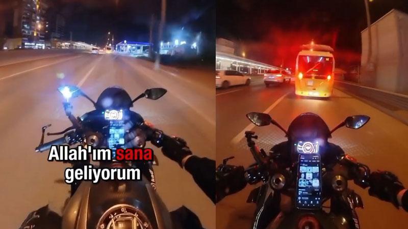 Bursa'da motosiklet, önünde duran belediye otobüsüne çarptı. Bu sırada, motosikletlinin, "Allah'ım sana geliyorum" dediği anlar, kask kamerasına yansıdı.