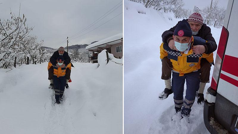 Düzce'nin Gümüşova ilçesinde göğüs ağrısı çeken Hasan Türken’e (79) müdahale etmeye giden sağlık ekibi kar engeline takıldı. Türken, ilk müdahalenin ardından ambulans şoförü tarafından 500 metre sırtında taşındıktan sonra hastaneye götürüldü.
