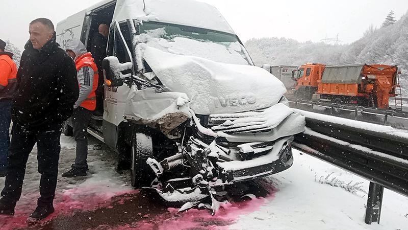 İlk kaza, saat 15.00 sıralarında Anadolu Otoyolu'nun Köroğlu rampaları mevkisinde meydana geldi. İstanbul yönüne giden hafif ticari, kar nedeniyle kayganlaşan yolda önünde seyreden yolcu otobüsüne çarptı. Bu sırada kazanın olduğu bölgede aynı yönde giden 1 otomobil de önündeki TIR'a çarptı. Aynı bölgedeki üçüncü kazada da otomobil kayarak kamyona arkadan çarptı. Peş peşe yaşanan kazalarda 6 araç hasar görürken, 1 kişi hafif şekilde yaralandı. Yaralı ambulansla hastaneye kaldırılırken, kazalar nedeniyle otoyolda ulaşım bir süre kontrollü şekilde sağlandı.