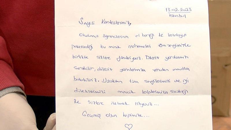 Minik öğrenciler mektuplarında, "Sevgili kardeşlerimiz, okulumuz öğrencilerinin el birliği ile hazırlayıp paketlediği bu minik malzemeleri tüm sevgimizle sizlere gönderiyoruz. Dileriz yaralarınızı sarabilir, dileriz yarınlarınıza yeniden umut olabiliriz. Uzaktan tüm sevgilerimizi ve iyi dileklerimizi minicik kalplerimizin sıcaklığı ile sizlere iletmek istiyoruz. Geçmiş olsun hepimize" ifadelerine yer verdi. Öğrencilerin mektubunun yer aldığı kitap ve oyuncaklar, 'gezici kütüphane' ile bölgeye gönderildi.