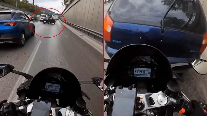 Aniden önüne kıran otomobile çarpan motosikletin sürücüsü yere düştü; kaza kask kamerasında