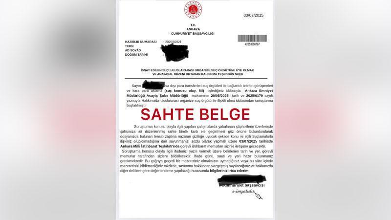 Ankara Cumhuriyet Başsavcılığı, savcılık, emniyet ve Milli İstihbarat Teşkilatı (MİT) gibi kurumların isimlerini kullanarak hazırlanan sahte belgelerle dolandırıcılık yapıldığını belirterek, vatandaşların bu tür belgelere itibar etmemesi ve arayan numaraları engelleyerek, kolluk birimlerine başvurmaları konusunda uyardı.
