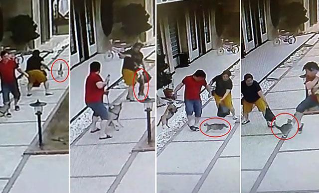 Anne kedi, yavrularını korumak için köpek ve sahiplerine saldırdı