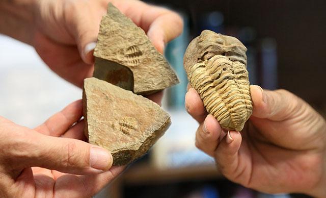AÜ Mühendislik Fakültesi Jeoloji Mühendisliği'nden Prof. Dr. Erdal Koşun, derslerinde dünyanın oluşumundan izler taşıyan birçok kayaç, mineral ve fosil kullanıyor. Yaptığı saha çalışmaları sırasında bulduğu birbirinden ilginç ve milyonlarca yıllık yaşa sahip kayaç, mineral ve fosillerden odasında küçük bir müze de oluşturan Prof. Dr. Koşun, dünyanın en eski fosili olarak bilinen ve ikisini de Türkiye'de bulduğu, yaşları 250-500 milyon yıl öncesine kadar uzanan iki trilobit fosiline de sahip.