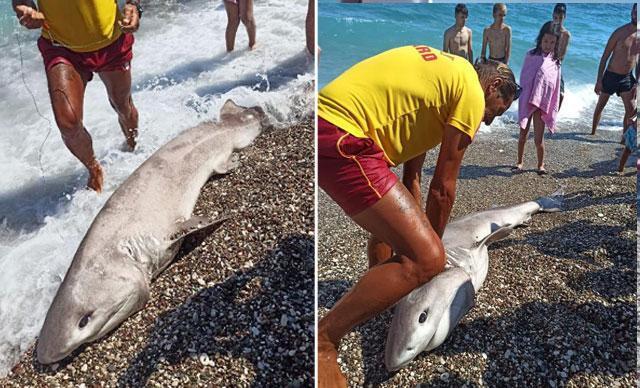 Turizm kenti Antalya'nın dünyaca ünlü Konyaaltı Sahili'nde denize girenler, 20 metre açıkta beyaz renkli bir şeyin suda hareketsiz olduğunu gördü. Denizde yüzenlerden birinin boğulmuş olabileceğini düşünenler durumu cankurtarana haber verdi. Hızla bölgeye giden cankurtaran, suyun üzerinde hareketsiz duran cismin, camgöz cinsi bir köpek balığına ait olduğunu gördü ve öldüğünü belirledi. Yüzgecinden sürükleyerek kıyıya çıkarılan köpek balığının, 2 metre olduğu görüldü.