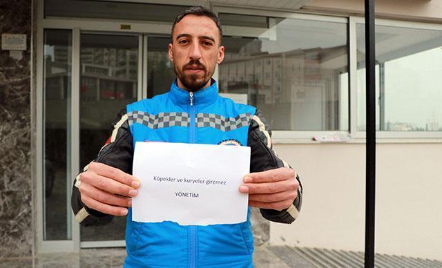 Merkez Çukurova ilçesi Huzurevleri Mahallesi'ndeki apartmanın yöneticisi, binanın giriş kapısına 'Köpekler ve kuryeler giremez' yazılı kağıt yapıştırdı. Söz konusu binanın sakinlerinden birine sipariş getiren Adana Motosikletli Kuryeler Derneği Başkanı Yalçın Parmak ise girişteki yazıyı görünce şoke oldu. Duruma çok üzülen Parmak, karşılaştığı apartman yöneticisini uyardığında ise sert tepkiyle karşılaşıp binadan kovulduğunu iddia etti.