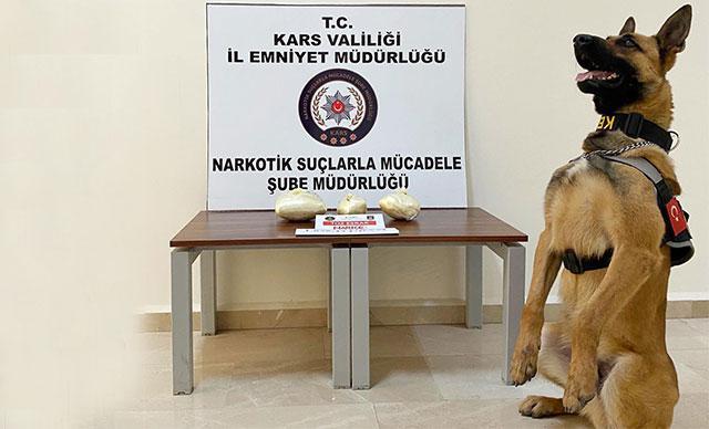 Kars'ta düzenlenen uyuşturucu operasyonunda, durdurulan araçta narkotik köpeği 'Odin' ile yapılan aramada 1 kilo 875 gram toz esrar ele geçirildi. Odin, uyuşturucu ile poz verdi.
