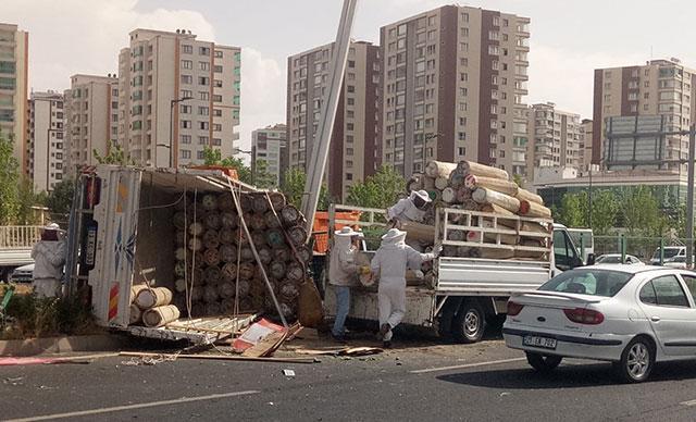 Diyarbakır'da arı kovanı yüklü kamyonetin devrilmesi sonucu etrafa dağılan arılar, kazada yaralananlara müdahale eden sağlık görevlileri ile çevredekilere zor anlar yaşattı.