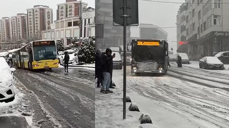 Arnavutköy'de durağa yanaşmaya çalışan İETT otobüsü kar yağışı nedeniyle kaydı.Başakşehir'de ise İETT otobüsü karla kaplı yolda yokuşu çıkamadı.