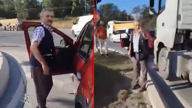 Olay, bugün sabah saatlerinde Edirne asfaltı Caddesi’nde meydana geldi. İddiaya göre, hafriyat kamyonu şoförü aracın kör noktasından geçmek üzere olan bir otomobile çarptı. Kaza sonrası hafriyat kamyonu şoförü ile otomobil sürücüsü arasında tartışma çıktı. Otomobilinden inen kişi, kamyon şoförünü eline bıçağı alarak tehdit etti. Hafriyat kamyonu şoförü ise o anları cep telefonu kamerası ile kaydetti.