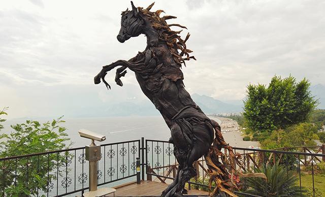 Antalyalı geri dönüşüm sanatçısı Adnan Ceylan'ın, Türkiye'nin en büyük orman yangını olarak kayıtlara geçen Manavgat yangınında zarar gören ağaçlardan elde ettiği odun ve tahta parçalarıyla yaptığı at heykeline, Konyaaltı Seyir Terası üzerinde video klip çekildi. Ceylan, 'Manavgat' adını verdiği atın 4,5 metre yüksekliğinde, 250 kilo ağırlığında, şaha kalkmış aygır görünümünde olduğunu ve doğanın uyanışını temsil ettiğini söyledi.