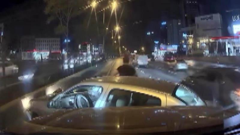 Sürücülerden biri en sağ şeride geçti. Ardından da orta şeritte ilerleyen araca yakınlaştı. Orta şeritte ilerleyen otomobil sürücüsü direksiyon hakimiyetini kaybetti. Orta şeritten bir anda sol şeride geçen otomobil, yan döndü ardından da hızla bariyerlere vurdu. Aynı yönde seyir halinde olan ve yaşananları kaydeden başka bir araç sol şeritte yan dönen otomobile çarptı. Kazaya neden olan sürücü hızla olay yerinden kaçarken, kaza anı araç kamerasına yansıdı.