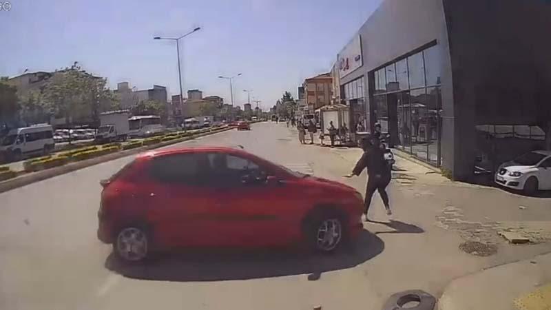 Kaza anı, park halinde bulunan aracın kamerasına yansıdı. Görüntülerde otomobilin savrularak yolda yürüyen kadına çarptığı anlar yer alıyor. Kadın çarpmanın etkisiyle park halindeki başka bir otomobilin önüne düşüyor. Çevredekiler ise kazada yaralanan kadına yardım etmek için koşuyor.