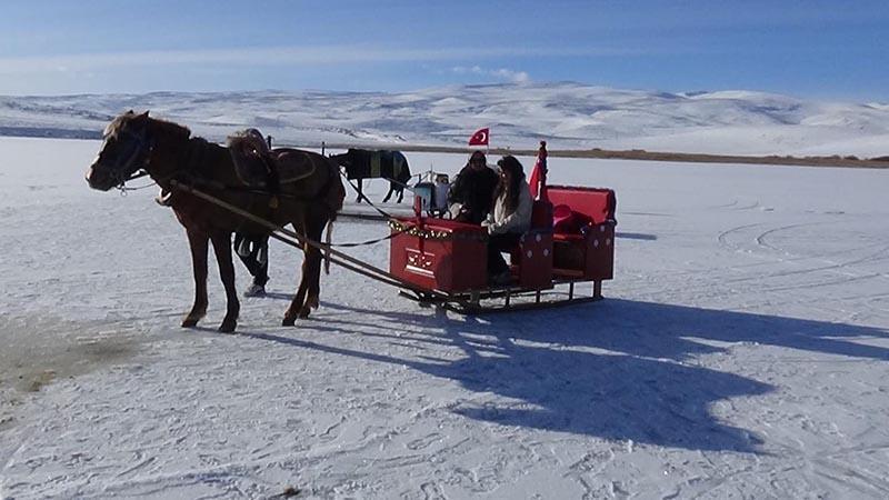 Kars'ın Arpaçay ilçesi Taşbaşı köyünde buz tutan göle inen kızakçılar, bölgeyi gezmeye gelen misafirlerini gezdiriyor. Gölde buz kalınlığının 20 santimetreye ulaştığını ifade eden kızakçılar, "Atlarımızı çıkardık, atlı kızaklarla gezinti yapıyoruz. Mart ayına kadar ağırlamaya çalışacağız" dedi.