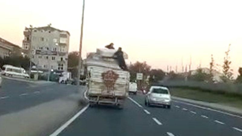 Görüntü, Ambarlı Mahallesi'ndeki Sarı Zeybek Caddesi'nde kaydedildi. Görüntülerde ev eşyaları yüklü kamyonun üstüne bir yatağın bağlanmadan koyulduğu görülüyor. İki kişi ise hiçbir güvenlik önlemi almadan kamyonun üzerinde yolculuk yapıyor. Zaman zaman hızlanan kamyondaki yatağın havalandığı da görülüyor. Trafikteki diğer sürücüler, bu tehlikeli anları cep telefonu kamerasıyla kaydetti.